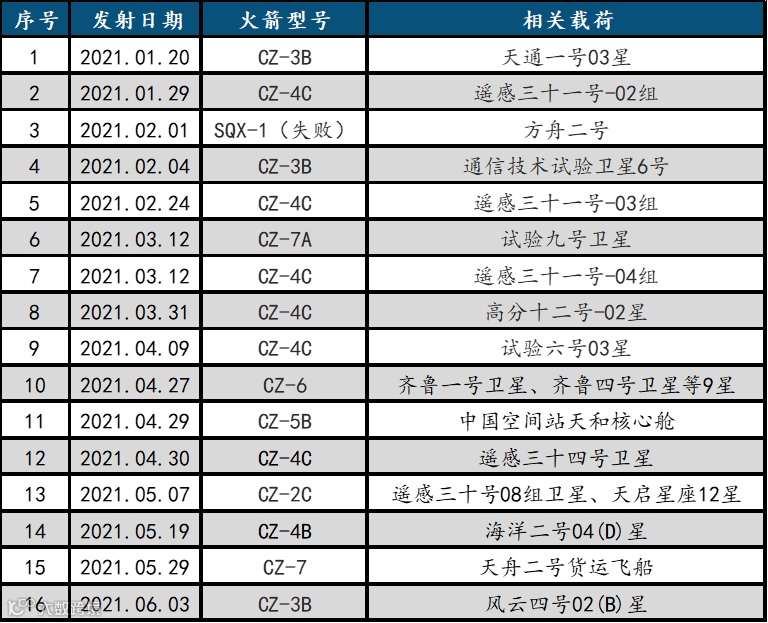 此外,“十四五”期间,航天产业也有望迎来高景气发展。作为十四五元年的2021年,航天科技集团在年初计划安排40余次宇航发射任务,截至到2021年6月4日,我国已经进行了16次航天发射,相较于2019年的9次以及2020年的12次均有所提高。诸多型号的发射,均预示着我国“十四五”重大航天工程中的载人航天空间站工程建设大幕即将拉开,而未来依靠该类航天重大项目订单驱动的航天装备产业链上的相关上市公司业绩也有望兑现。