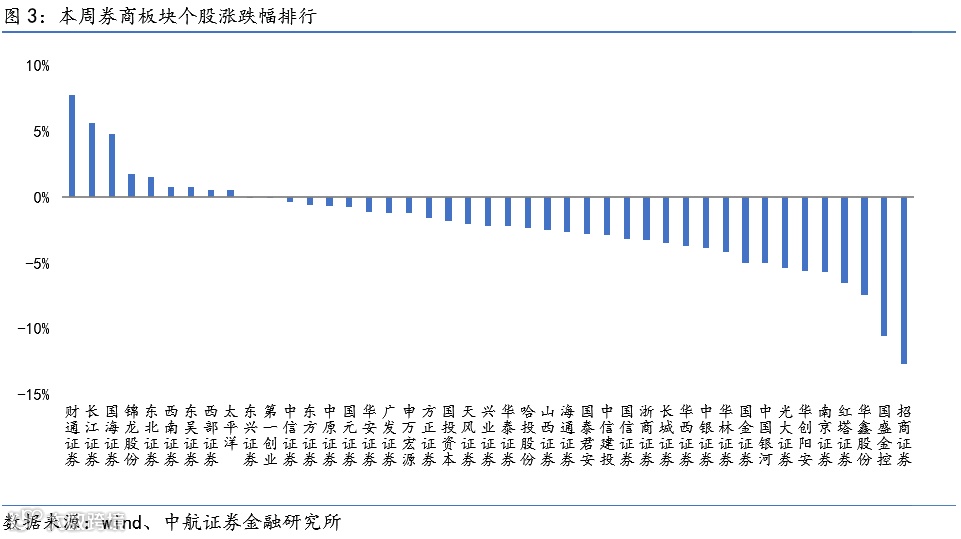 涨跌幅前三:财通证券(+7.76%)、长江证券(+5.63%)和国海证券(+4.75%);