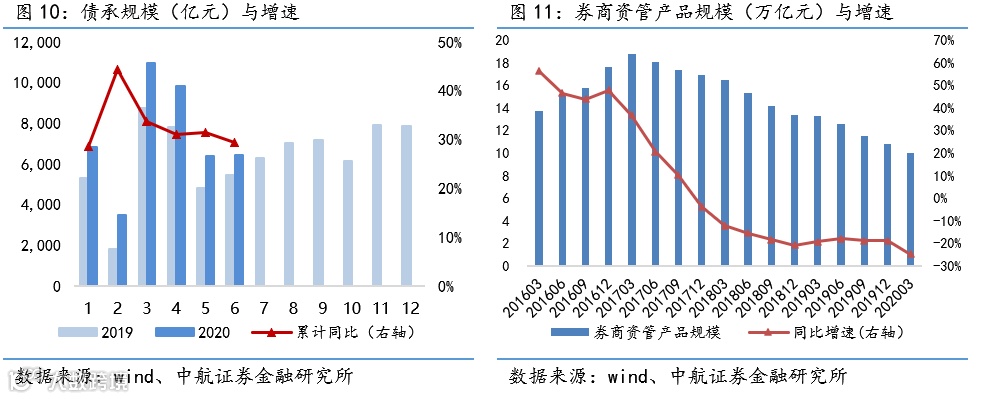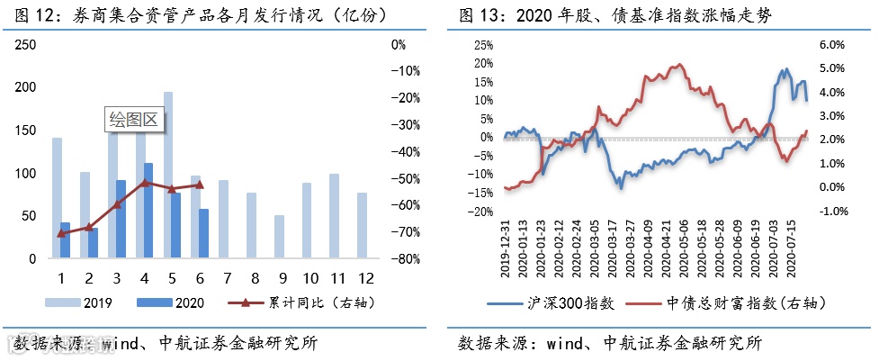 资管:截至2020Q1,券商资管规模合计9.97万亿元,同比-24.91%。截至6月年内券商集合资管产品新发行份额累计同比-52.58%。