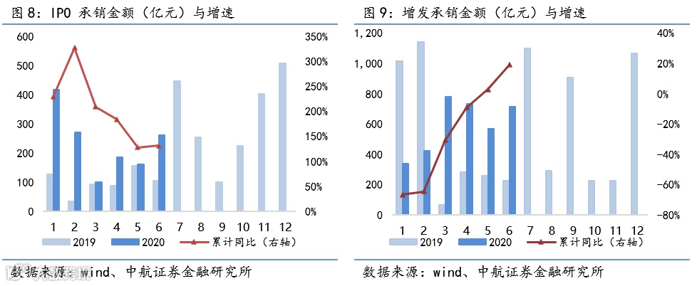 投行:截至07.24,7月股权融资1602亿元,其中首发、增发融资分别为911亿元、474亿元;今年前6月,首发、增发融资累计同比分别+130.86%、+19.28%,券商累计主承债券规模同比+29.28%。