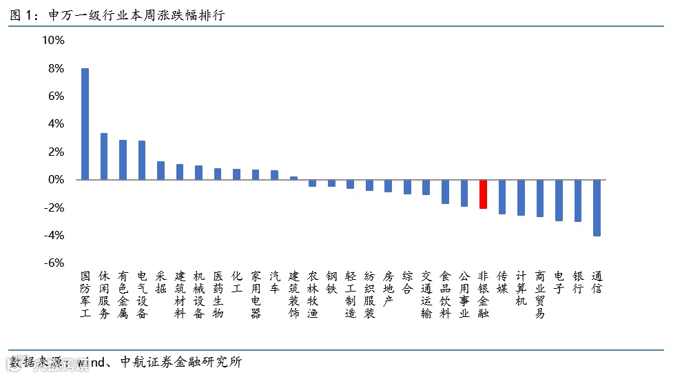 非银板块本周下跌2.03%,涨跌幅在28个申万一级行业中排第22。子板块方面,券商下跌2.36%,保险下跌1.28%,多元金融下跌2.49%。