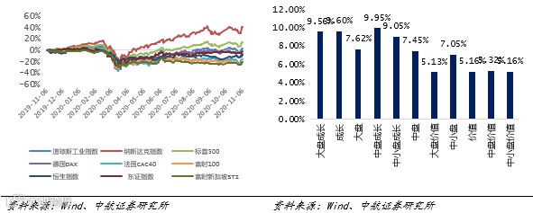 选举日前(9月-11月),市场普遍预计民主党有较大概率可以“横扫”,一旦民主党控制白宫和参众两院,大规模的财政刺激计划大概率获得通过。这加强了经济复苏的预期,通胀预期也同步提升。受此影响,美国十年期国债收益率上行超过20bp,美股价值风格大幅跑赢成长。目前大选对于参议院席位投票结果是共和党以48比46领先(需51票获得多数席位),如果共和党拿下参议院可能导致刺激政策无法在短期内推出。另外一方面,美国疫情形势继续恶化,根据我们的监控指标,美国的医疗资源已经出现挤兑,拜登对于应对疫情的主张更为积极,其计划包括推出全国性的新冠病毒检测机制、强制在公共场所佩戴口罩等,拜登获得大选胜利之后,如能顺利推行他的抗疫政策,部分地区可能再次出现封锁,对于美股而言都是利空因素,美股短期波动可能加大。