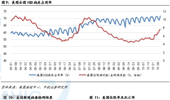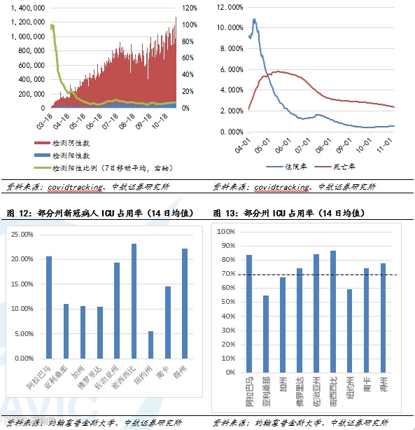 全球疫情,截至11月7日,全球感染人数已经超过4970万人,累计死亡人数超过125万人。据美国约翰斯·霍普金斯大学发布的全球新冠肺炎数据实时统计系统,截至美国东部时间11月6日晚6时,全美共报告新冠肺炎确诊9707096例,死亡235761例。过去24小时,美国新增确诊120440例,新增死亡984例。我们对美国ICU病床占用率进行统计,截至10月31日美国全国ICU占用率为71.57%,已经超过我们之前提出的70%-80%警戒值,美国全国病床利用率为7.62%,较上周有明显上升,近期全美病床占用率呈上升趋势,但仍低于我们提出的15%-30%警戒值。此外,近期美国的住院率有明显的上升,死亡率缓慢回落。对美国部分州进行单独统计,阿拉巴马州、德克萨斯州和密西西比州的新冠病人ICU占用率14日平均值已超过20%,佐治亚州接近20%水平;ICU病床总占用率14日均值,阿拉巴马州、佐治亚州、密西西比州、佛罗里达州、德克萨斯州和南卡罗莱纳州均超过70%的警戒值,上述各州的医疗资源存在出现挤兑的风险,如果进一步恶化可能导致政府再度封锁经济,需要持续关注。