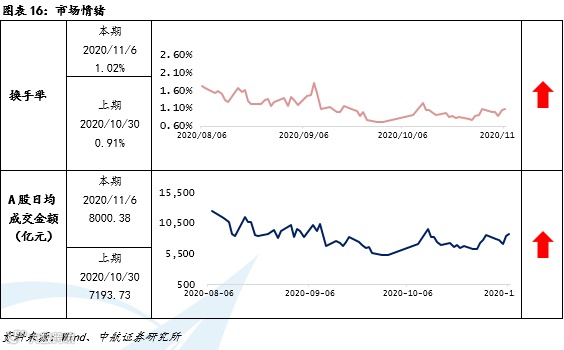 市场情绪方面,本周日均换手率为1.02%,上周为0.91%,有所上升。A股日均成交金额为8000.38亿元,上周为7193.73亿元,市场情绪本周有所回温。