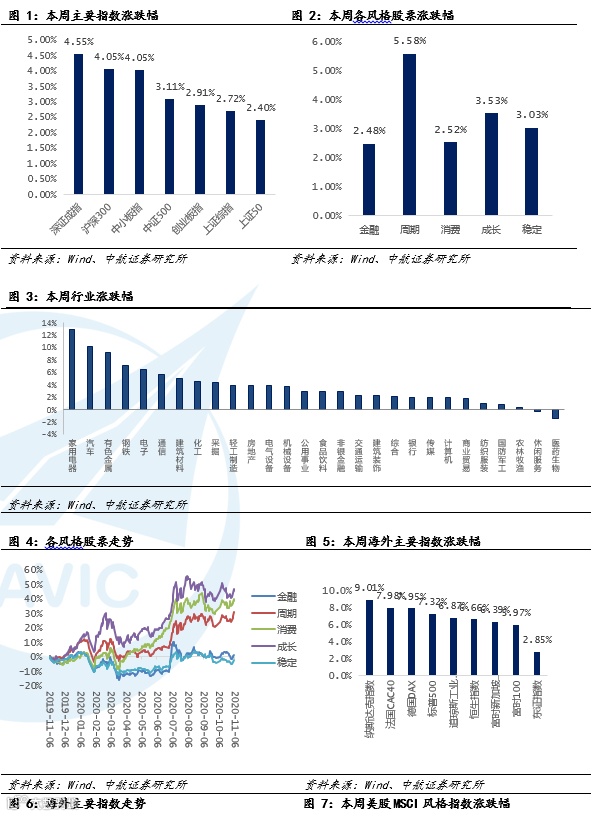 海外方面,本周道指涨6.87%,纳指涨9.01%,标普500指数涨7.32%。德国DAX指数周涨7.95%;法国CAC40指数周涨7.98%;英国富时100指数周涨5.97%。