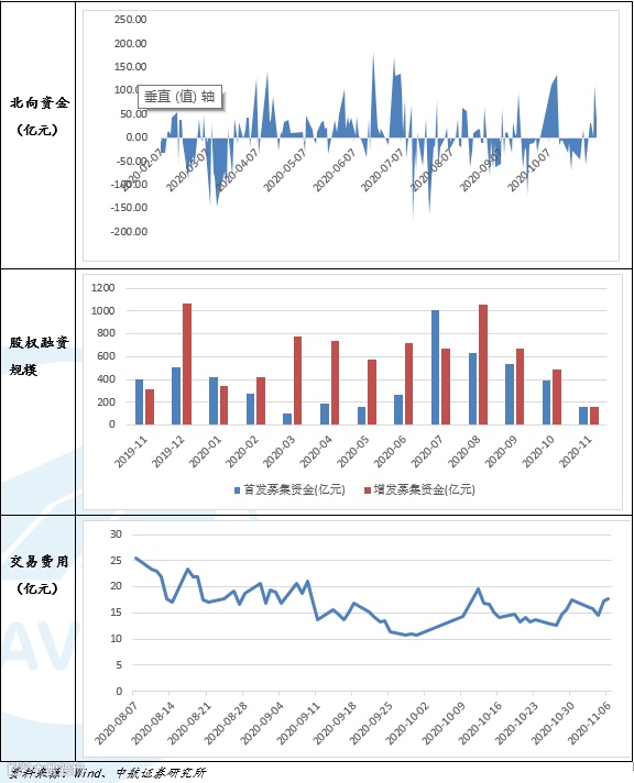 资金流向,北向资金本周累计净流入214.16亿元,前一期为净流出110.854亿元。本周新发行的基金个数为38个,上周为40个;本周基金发行规模为608.05亿元,上周为501.27亿元。11月份截至11月6日IPO募集资金为157.58亿元,增发募集资金163.06亿元。交易费用本周为81.60亿元,上周为73.38亿元。