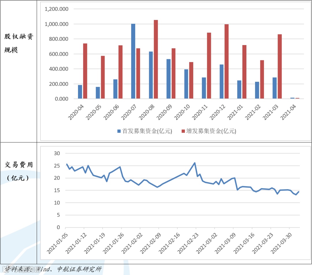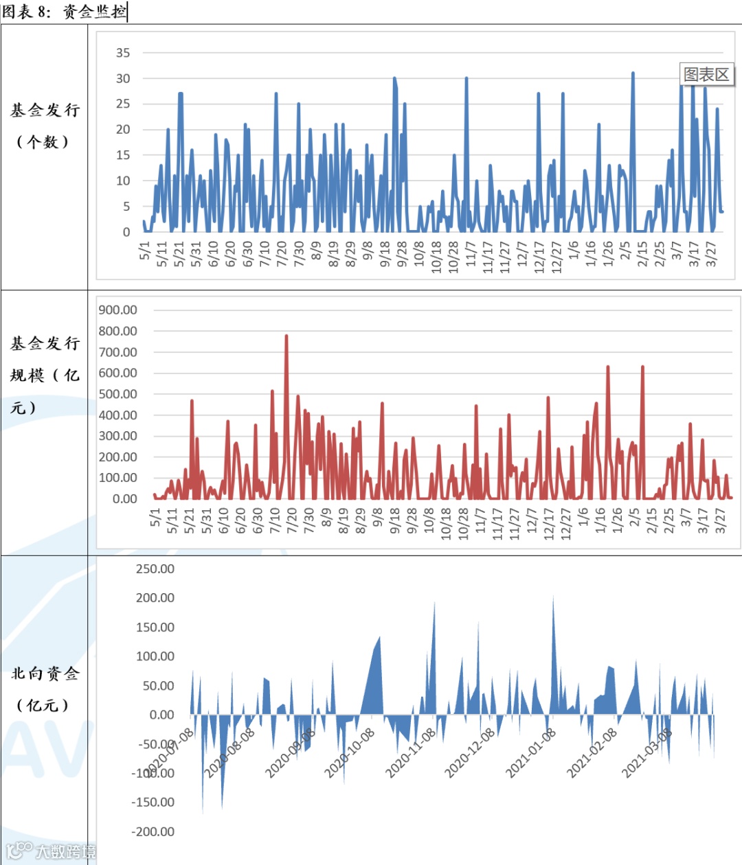资金流向方面,北向资金本周累计净流出99.38亿元,前一期为净流入141.64亿元。本周新发行的基金个数为51个,上周为76个;本周基金发行规模为150.35亿元,上周为402.20亿元。2021年4月份截至4月2日IPO募集资金为17.3亿元,增发募集资金12.5亿元。交易费用本周为71.65亿元。