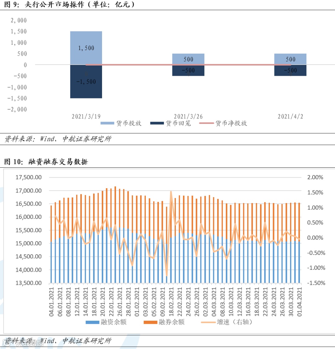 流动性方面,央行公开市场操作上,继前三周之后,本周央行公开市场操作净投放继续为0。本周,7天DR007利率整体呈下降态势,4月3日收于2.00%,比上周末下降0.22pcts,SHIBOR1W先升后降,周五收于2.145%,比上周五下降0.028pcts。本周货币市场利率仍然围绕着央行逆回购利率的2.2%上下微幅波动,DR007和SHIBOR1W周五均收于2.2%下方,显示货币市场资金面相对宽裕。结合本周表现较好的PMI数据,预计央行未来一段时间放松货币政策的概率较小。