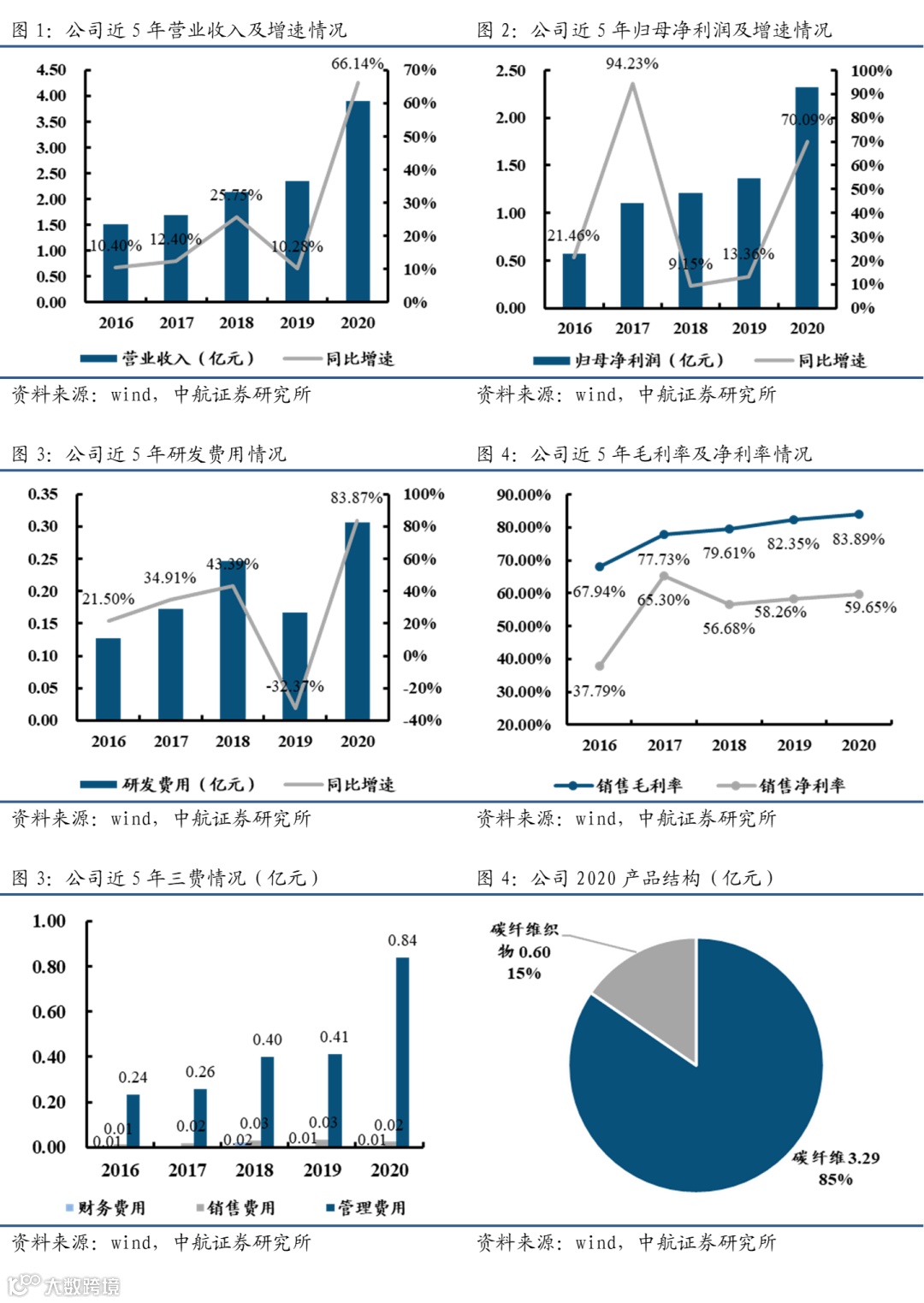 公司2020年营收、归母净利润同比增长66.14%和70.09%。报告期内公司碳纤维及织物共实现销售116.16吨,同比增长45.47%,主要得益于2020年与客户签订2.65亿元的大额订单全部执行完毕,推动了公司产品销量的大幅提升,而后续合同的签订正在按计划有序推进。分产品看,公司销售产品主要为高性能碳纤维(收入3.29亿元,+85.27%)及碳纤维织物(收入0.60亿元,+12.30%)。公司高性能碳纤维的产能及销售量的释放一定程度上助力了公司业绩的大幅上涨。此外公司2020年ROE提升明显(21.47%,+4.52pcts),盈利能力快速提升。
