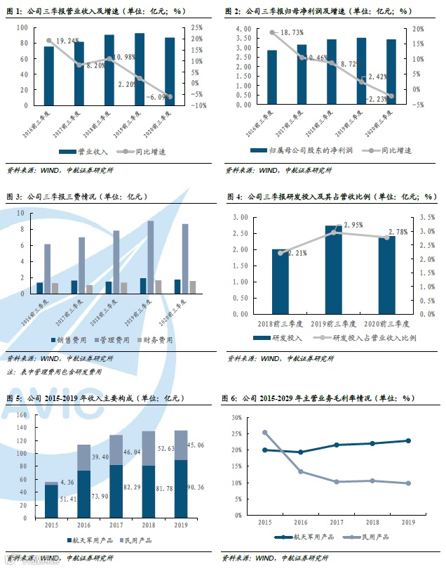 具体来看,公司的业务主要包含航天电子产品的研发与生产销售及电线、电缆产品研发与生产销售。其中,2019年公司业务中的航天军用产品与民用产品收入比例约为2:1,毛利润贡献占比约为5:1,而在2020年上半年,公司主要控股参股公司中,存在民品业务的子公司航天电工由于地处武汉,受疫情影响较大,净利润(95.91万元,-95.54%)出现大幅度下滑,同时,在2020年10月底,公司公告,拟将从事民品业务(钻井测斜设备研发生产)的子公司普利门电子公司100%的股权协议转让,以优化资源配置(普利门电子公司2018年净利润为-1.21亿元,2019年净利润仅为27万元),总体来看,我们认为,2020年,公司民品业务收入及毛利润的贡献占比可能会进一步下降,航天军用产品或是公司业绩逐步恢复的重要保障,而四季度又是公司军品业务收入集中确认的时间,在此基础上,公司全年收入及净利润有望恢复至2019年水平。