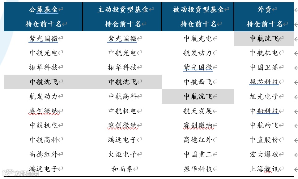 图表4:军工行业公募基金及外资持仓前十名