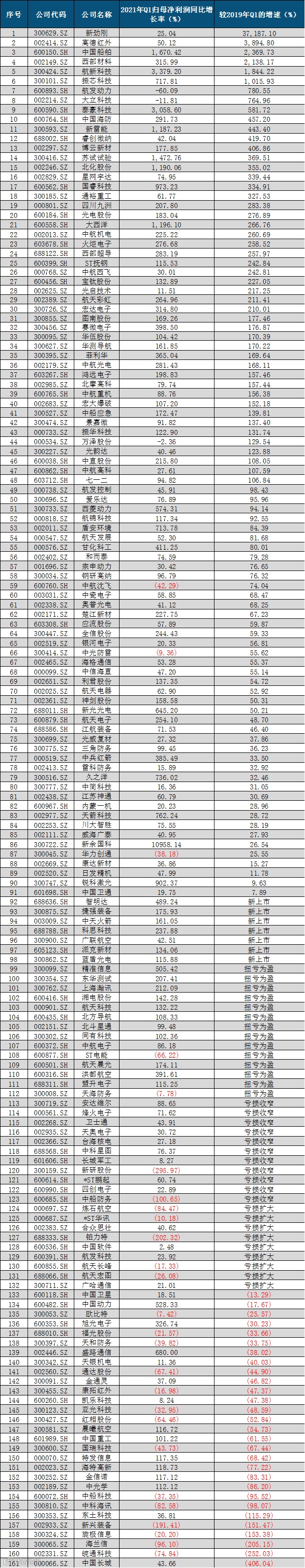 个股方面,不考虑资产重组的影响,高德红外(2021年一季度归母净利润较2019年一季度的增速+3894.80%)、西部材料(+2138.17%)、航新科技(+1844.22%)、振芯科技(+1015.93%)、航发动力(+780.55%)等上市公司2021一季度业绩相较于2019一季度增速居前,尤其是航空航天装备领域上市公司增速居前。表现出“十四五”期间,我国航空航天及军工信息化产业有望迎来高景气发展。