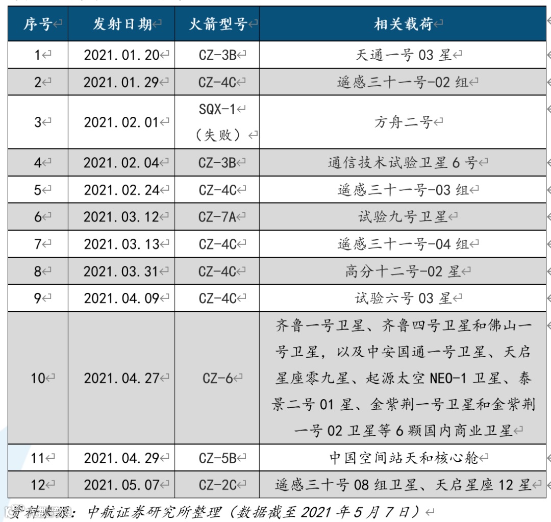 此外,“十四五”期间,航天产业也有望迎来高景气发展。作为十四五元年的2021年,航天科技集团在年初计划安排40余次宇航发射任务,截至到2021年5月7日,我国已经进行了12次航天发射,相较于2019年的7次以及2020年的9次均有所提高。诸多型号的发射,均预示着我国“十四五”重大航天工程中的载人航天空间站工程建设大幕即将拉开,而未来依靠该类航天重大项目订单驱动的航天装备产业链上的相关上市公司业绩也有望兑现。