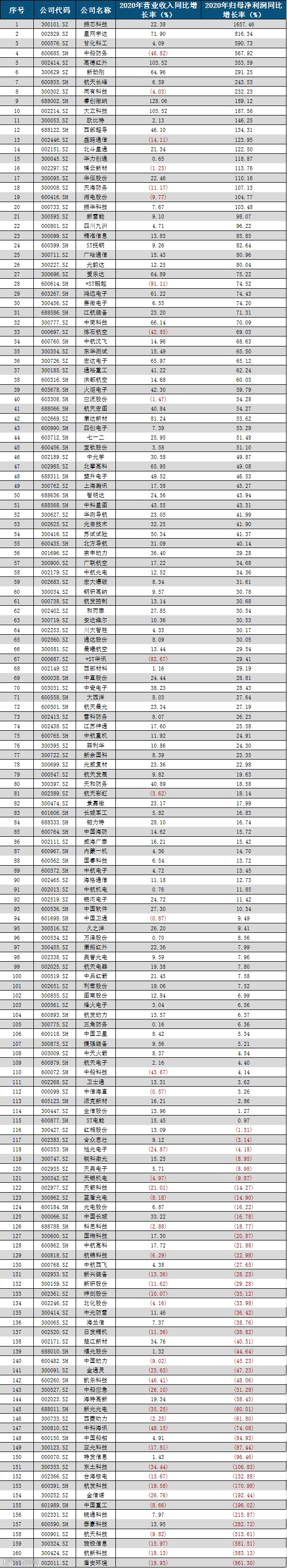 二、军工行业上市公司2020年及2021一季度业绩情况