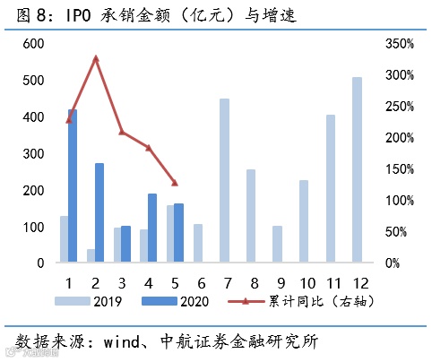 投行:截至06.05,6月股权融资211亿元,其中IPO 89亿元,增发58亿元,其他再融资64亿元,截至5月末IPO、增发募资累计同比分别+ 127.15%、+2.68%;截至5月末券商累计主承债券规模同比+30.72%。