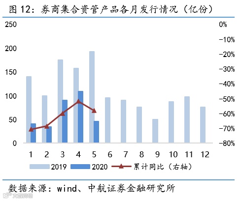 资管:截至2020Q1,券商资管规模合计9.97万亿元,同比-24.91%。截至5月末年内券商集合资管产品累计新发行份额320亿份,同比-58.12%。