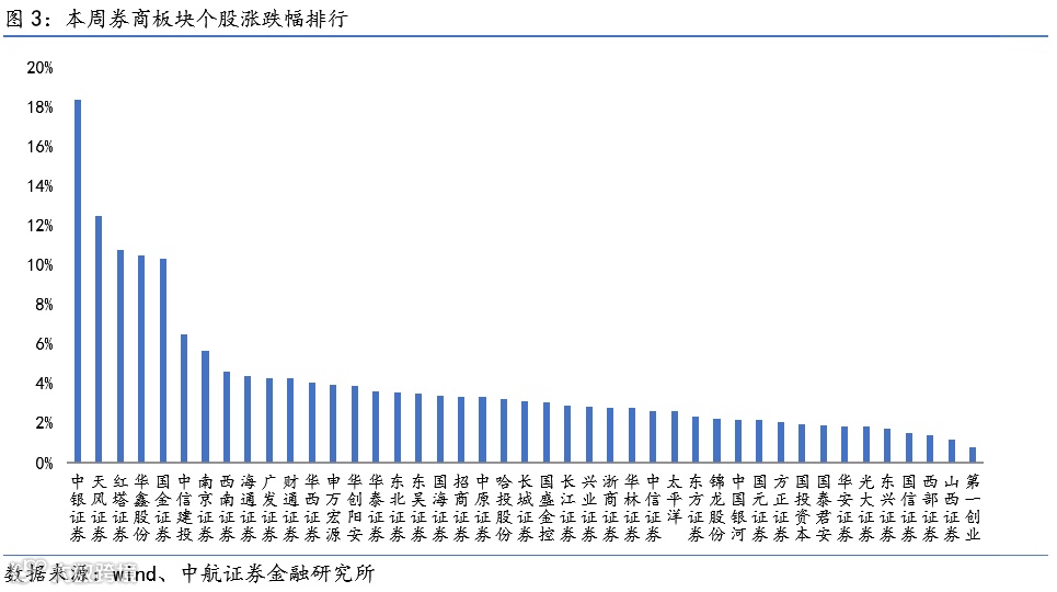 涨跌幅前三:中银证券(+18.35%)、天风证券(+12.43%)和红塔证券(+10.72%);