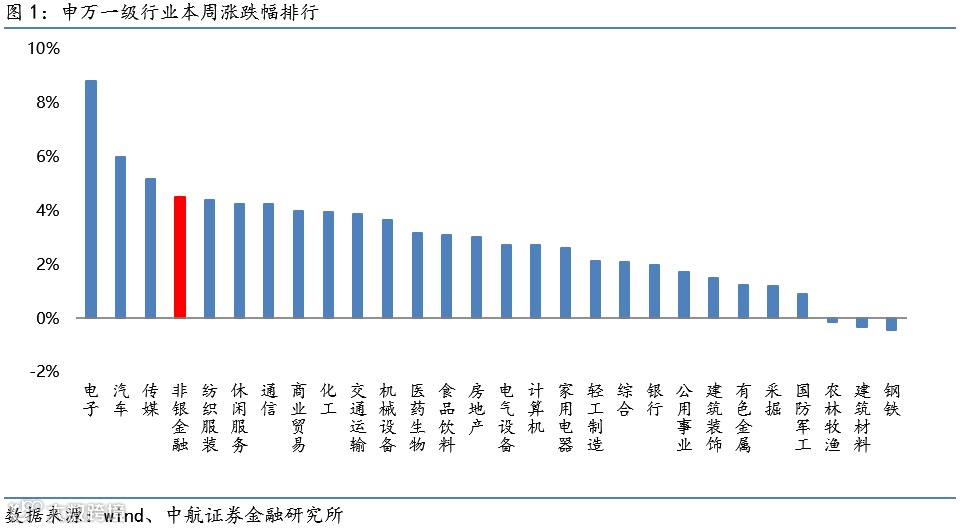 非银板块本周上涨4.53%,涨跌幅在28个申万一级行业中排第4。子板块方面,券商上涨3.52%,保险上涨6.12%,多元金融上涨1.00%。