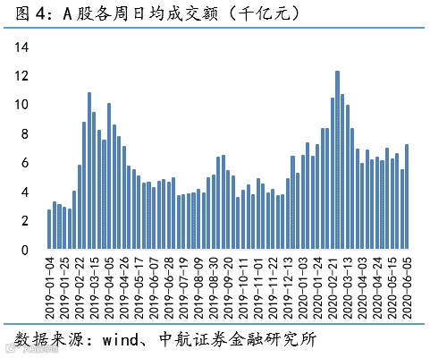 本周(2020.06.01-2020.06.05)基准指数涨跌:沪深300(+3.47%)、上证综指(+2.75%)、深证成指(+4.04%)、创业板指(+3.82%)。