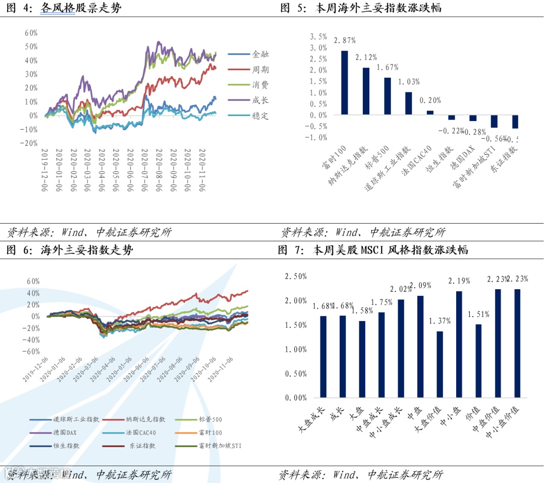 海外方面,本周欧美股市普涨,本周道指涨1.03%,纳指涨2.12%,标普500指数涨1.67%。德国DAX指数周跌0.28%;法国CAC40指数周涨0.20%;英国富时100指数周涨2.87%。