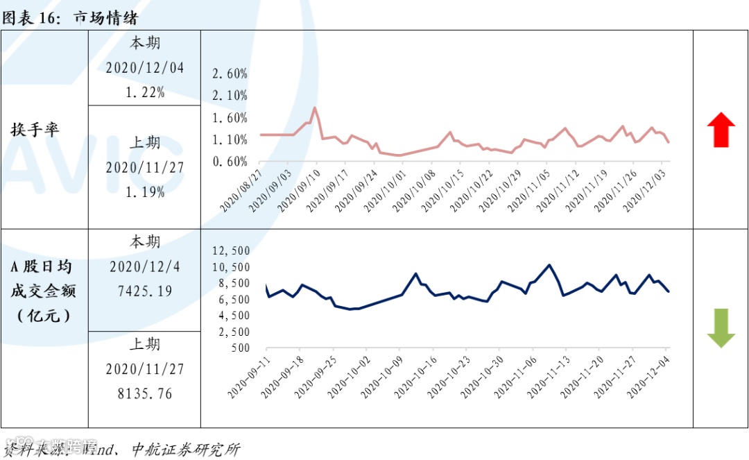 市场情绪方面,本周日均换手率为1.22%,较上周的1.19%有所上升。A股日均成交金额为7425.19亿元,上周为8135.76亿元。