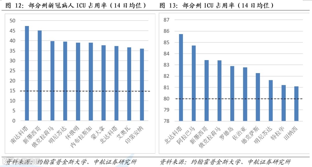 全球疫情方面,截至12月5日,全球感染人数已经超过6593万人,累计死亡人数超过186.3万人。美国方面,根据美国约翰斯·霍普金斯大学的统计数据显示,截至美国东部时间12月4日16:25(北京时间5日05:25),美国新冠肺炎确诊病例已经超过1429万,达到14297251例;死亡病例已超过27.8万,达到278083例。我们对美国ICU病床占用率进行统计,截至11月28日美国全国ICU占用率为75.20%,较上周再度攀升,持续超过我们之前提出的70%-80%警戒值,美国全国病床利用率为14.05%,较上周略有上升,且近几周呈明显上升趋势,已经逼近我们提出的15%-30%警戒值。美国全国检测阳性比率在上周短暂回落后本周再度攀升。我们对美国部分州进行单独统计,南达科塔州、新墨西哥州、俄克拉荷马州、明尼苏达州和怀俄明州的新冠病人ICU占用率14日平均值已超过或接近40%;ICU病床总占用率14日均值,美国排名前13位的州均超过80%,我们统计的美国五十个州和三个特区或领地中有35个ICU病床总占用率超过我们提出的70%-80%警戒值,这些州的医疗资源存在出现挤兑的风险,如果进一步恶化可能导致政府再度封锁经济,需要持续关注。