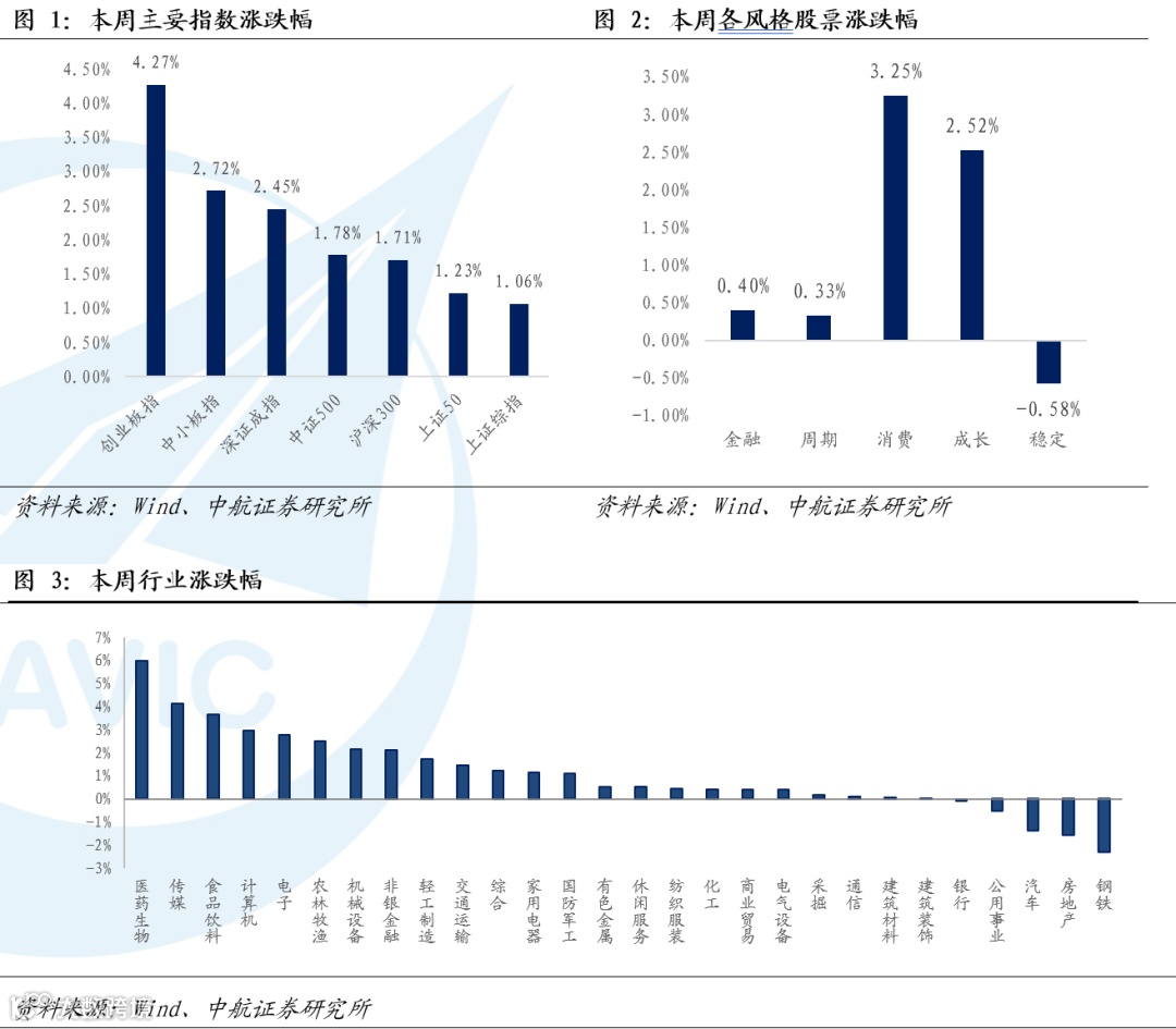 本周,上证指数涨1.06%;深证成指跌2.45%;创业板指涨4.27%,沪深300指数涨1.71%。