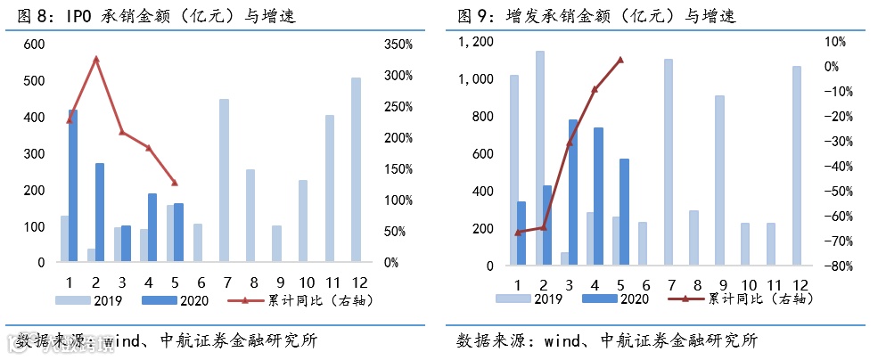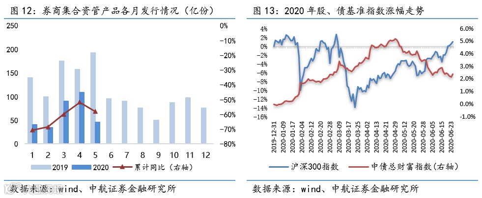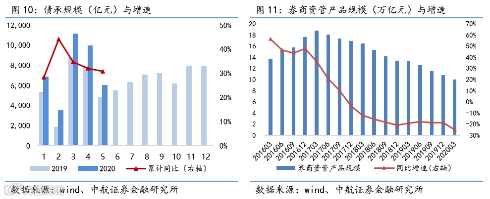 资管:截至2020Q1,券商资管规模合计9.97万亿元,同比-24.91%。截至5月年内券商集合资管产品新发行份额累计同比-58.12%。