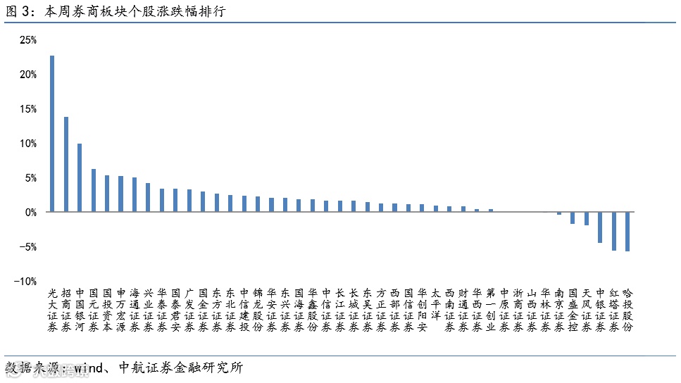 涨跌幅前三:光大证券(+22.64%)、招商证券(+13.76%)和中国银河(+9.90%);