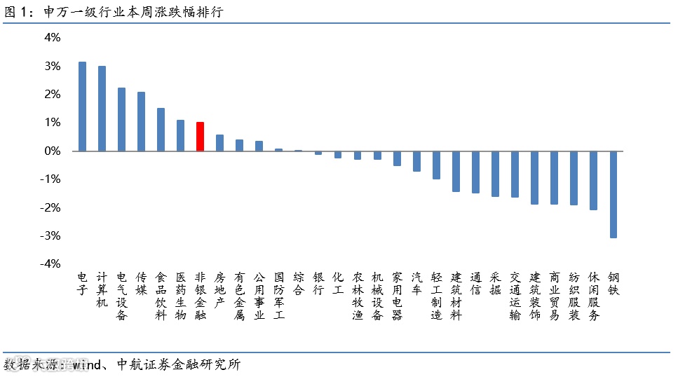 非银板块本周上涨1.00%,涨跌幅在28个申万一级行业中排第7。子板块方面,券商上涨3.01%,保险下跌1.44%,多元金融上涨2.07%。