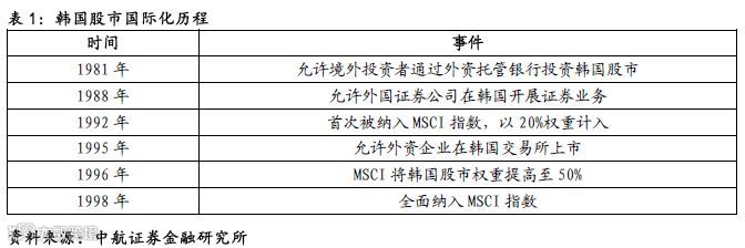 韩国股票市场国际化同样很早,1981年起韩国通过资本市场长期国际化计划逐步提高了资本市场投资的自由度,给予外国投资者投资韩国证券市场的机会,并成立了国际投资信托和韩国国家基金。1985年开始,随着韩国经济的快速增长,上市公司数量持续增加,韩国股市的市值总额迅速提升。