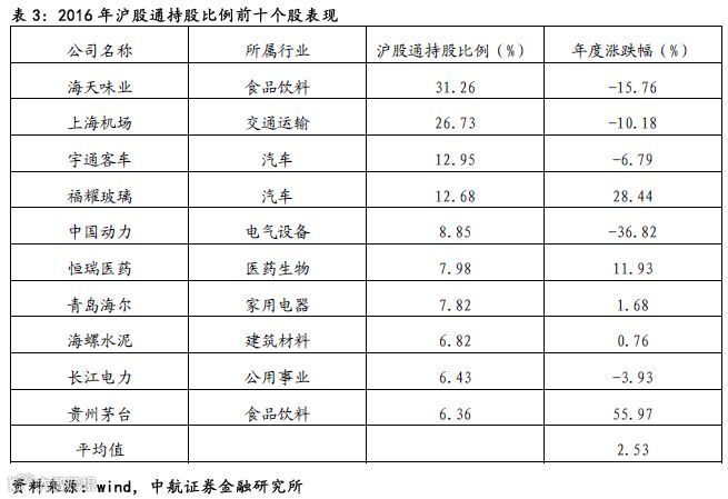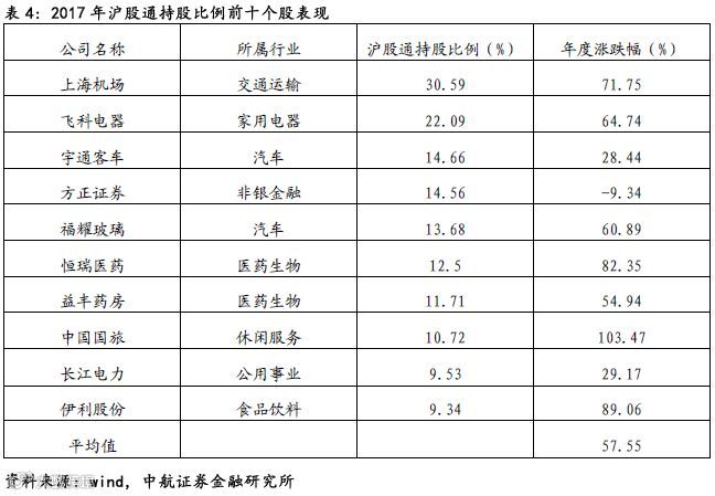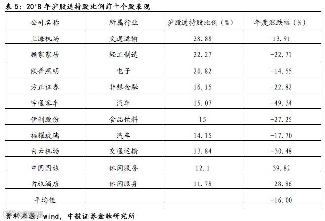 通过分析2016、2017和2018年沪股通持股比例前十的个股表现,不难发现,外资的投资风格通常倾向于行业龙头,年度平均收益率远远高于上证综指。(上证综指2016、2017和2018年的涨跌幅分别为-13.13%、6.56%和-24.59%)