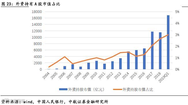 随着QFII、RQFII、沪港通和深港通等制度的试点和不断成熟,MSCI指数纳入带来的增量资金流入,境外机构和个人投资A股的渠道趋于多样化。同时,外资持股市值不断增长。2004年外资持股市值仅有71亿元,占A股总市值的0.21%。经过近十几年的对外开放后,截止到2019年一季度末,外资持有A股市值已经达到了16838.88亿元,占A股总市值的比例为2.99%。