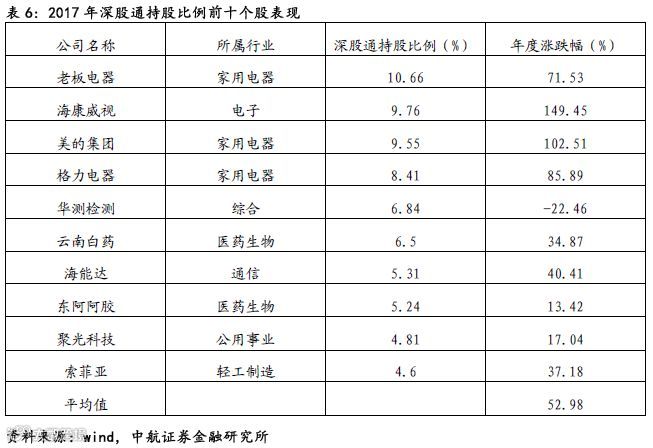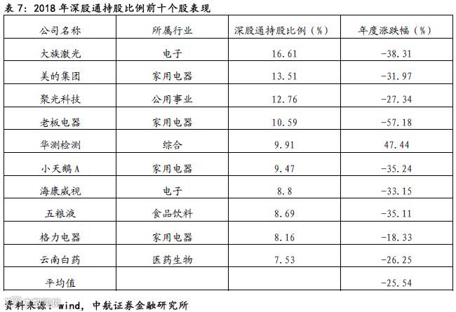 深股通开通时间较晚,通过分析2017和2018年深股通持股比例前十的个股表现,不难发现其持股特征和沪股通相似,通常聚焦于行业龙头,持股时间较长。从2017和2018年的两年数据来看,深股通持股的稳定性更高,持股比例前十的平均收益率远远高于深圳成指。(深圳成指2017、2018年的涨跌幅分别为8.48%和-34.42%)