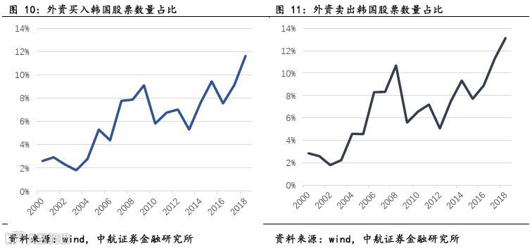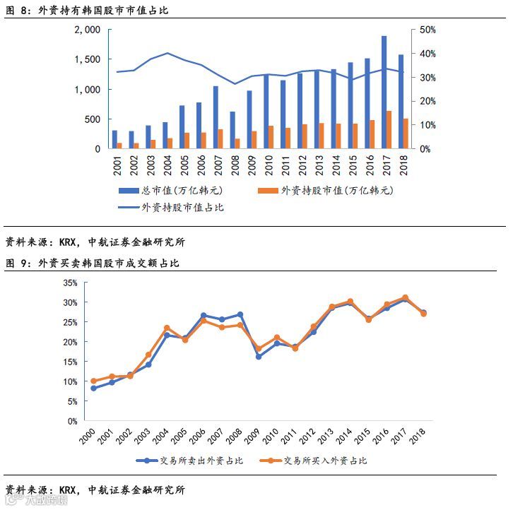 2001年的数据显示,韩国股市总市值(包括KOSPI、KOSDAQ、KONEX)308万亿韩元,外资持股市值99万亿韩元,占总市值的比重为32.2%。此后,外资持股市值占比一直呈上升态势,并在2004年达到高点,达到40.08%。在随后韩国股市市值持续增长的过程中,外资持股市值占比一直处在高位。2018年末的数据显示,韩国股市总市值达到1578万亿韩元,其中,外资持股市值为507万亿韩元,占总市值的比重为32.11%。