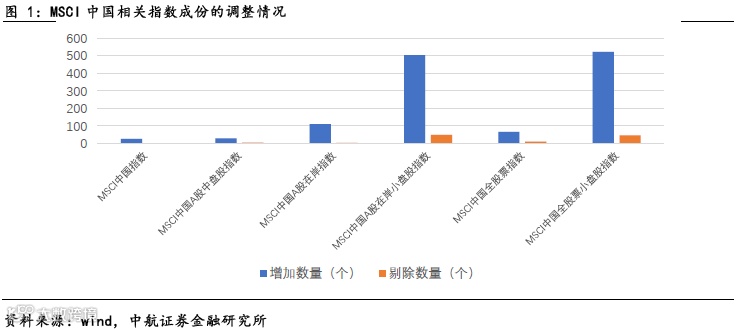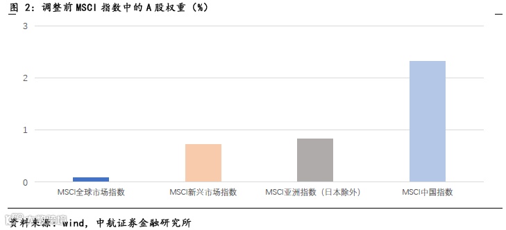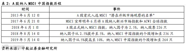 随着国内资本市场对外开放制度的建立和完善,A股的投资价值逐步受到了外资的认可。2017年6月21日,美国指数公司MSCI明晟宣布从2018年6月开始,将中国A股纳入MSCI新兴市场指数和MSCI ACWI全球指数, 初选股票数为222只。2018年6月1日,A股正式纳入MSCI指数,初步的纳入因子为之前公布的2.5%。此次正式纳入的股票数为226只。纳入MSCI指数是A股国际化的重要里程碑。2018年8月14日,MSCI发布实施A股纳入MSCI中国指数的第二步,将纳入因子从2.5%提升至5%,调整后A股占MSCI新兴市场指数的权重达到0.75%。2019年5月14日MSCI公司发布半年度指数审议结果,如期将A股纳入因子从5%提高至10%,包括18只创业板个股在内的26只中国A股纳入MSCI中国指数。