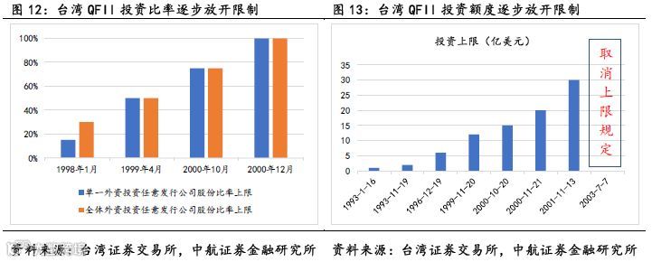 台湾的股票市场国际化经历了三个阶段:(1)准许华侨及外国人间接投资于台湾的证券,买卖受益凭证。1983年设立国际、光华、建宏、中华四家投信公司,在海外募集台币资金,投入台湾股市。(2)逐步放宽规定,允许外国证券公司进入台湾。就在这一时期,台湾于1990年准许外国专业投资机构(QFII)直接进入台湾证券市场。(3)全面开放侨外直接投资台湾证券市场,于1996年3月起开放外国自然人及法人直接投资台湾股市,并且在核准额度上放宽了限制。