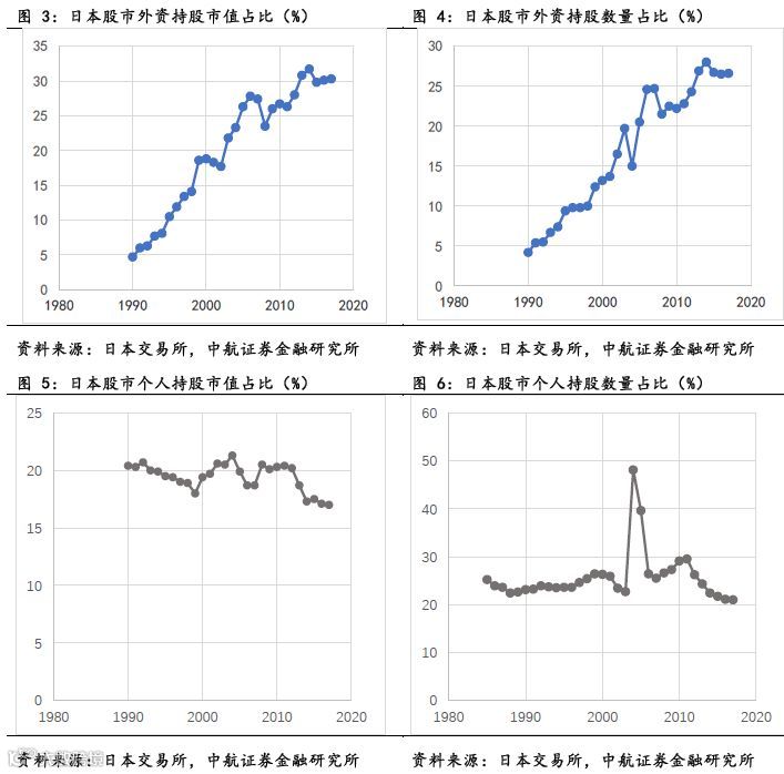 日本股市1964年开始国际化时间,很早就纳入MSCI指数。1990年的数据显示,日本股市中的外资持股比例为4.7%,外资持股数量占比为4.2%,说明外资持股的平均股票价格高于大盘均值。此后,两者一直呈上升态势。2014年,外资持股比例达到31.7%,持股数量占比为28%,两者均达到历史最高点。此后一直维持在高位。