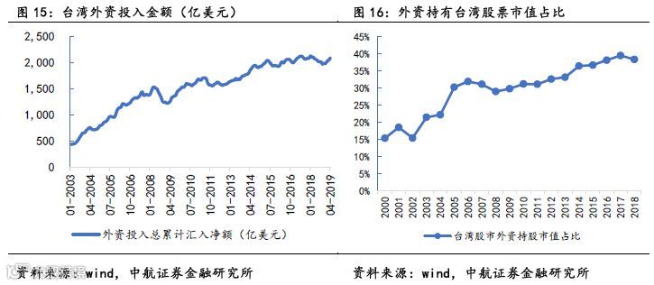 总体来看,尽管同日本、韩国和台湾等经济体相比,我国股市的国际化程度仍然偏低,然而资本市场对外开放的步伐未曾停止。随着QFII、RQFII、沪港通、深港通等基础制度的完善,MSCI纳入因子的引导确保了长期开放空间的打开,预计未来A股市场会继续向机构特征转变,而机构投资者尤其是外资持股比例的上升将是必然趋势。