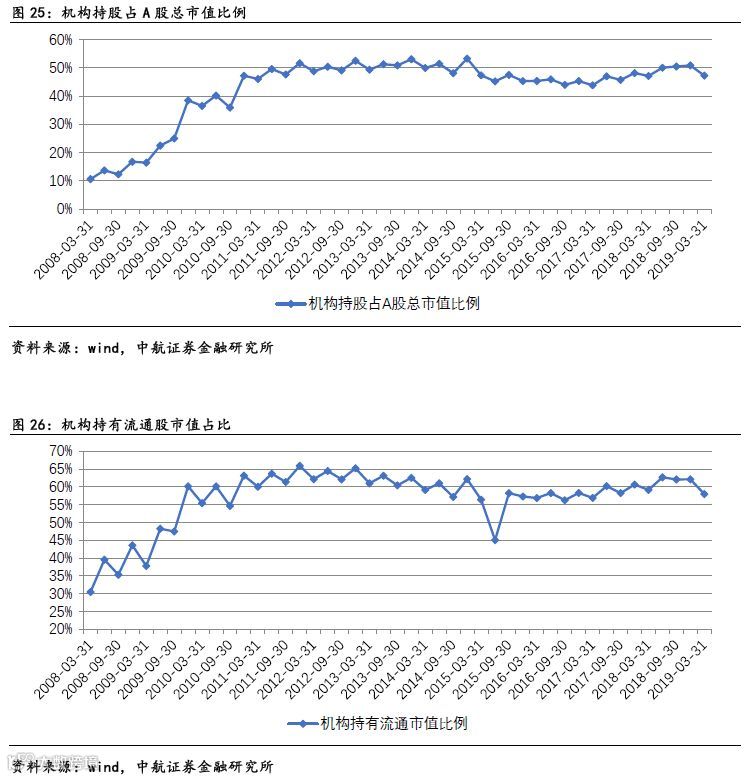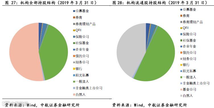我们把上市公司前十大股东近似模拟为机构,截至2019年3月31日的数据显示,机构投资者持有全部股份的市值占总市值比例为47.20%、持有流通股市值占比为57.97%,两者环比2018年数据出现下滑,预计和市场行情回暖、交投活跃、个人投资者环比增长有关。同成熟市场相比,A股的机构投资者占比仍然偏低,机构化空间巨大。