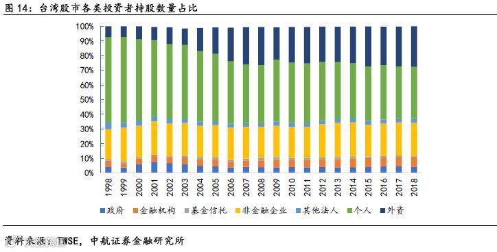 随着外资流入,台湾股市投资者结构出现了显著的变化。个人投资者持股数量占比从1990年的51.11%降至2018年的35.38%,机构投资者持股数量占比持续提高。1998年,外资持股数量占比为8.73%,2018年末外资持股数量占比创年度新高,为27.65%。