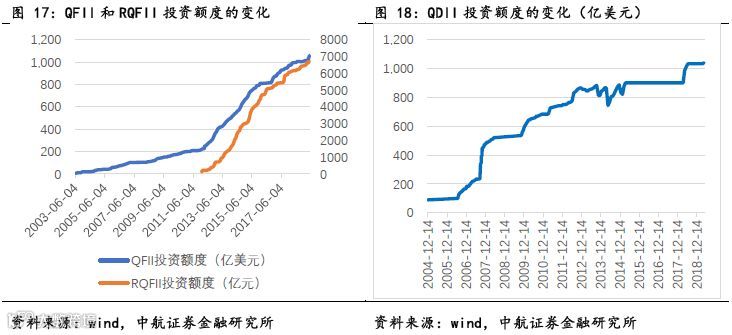 2003年6月17日,保监会发布《关于保险外汇资金投资境外股票有关问题的通知》,允许保险外汇资金投资境外成熟资本市场证券交易所上市的股票,包括参与境外上市配售、定向配售等方式,但投资品种仅限于中国企业在境外发行的股票,标志QDII制度的正式启动,这是我国资本项目有序开放的一个重要节点。截止到2019年4月29日,QDII投资额度为1039.83亿美元,和同期QFII的投资额度基本一致。通过投资流入和境外投资的制度设计,国内资本市场基本上建立了“请进来”和“走出去”的互联互通机制。
