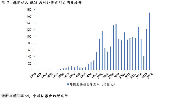 从MSCI指数的纳入进程来看,尽管国际化的步伐较日本缓慢,韩国的起点同样比较高。从部分纳入到全面开放仅仅用了六年时间。