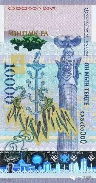 正面印有哈萨克斯坦独立以来的唯一一位总统——纳扎尔巴耶夫(Nazarbayev, 1940 ~)。他是一位典型的政治强人,早在苏联时代末期,他就已经成为哈萨克斯坦的领导人。1991年12月11日,哈萨克斯坦恋恋不舍地宣告脱离苏联独立,而纳扎尔巴耶夫则继续担任该国一把手。纳扎尔巴耶夫肖像左侧是首都阿斯塔纳的多座摩天大楼和该市地标——巴伊杰列克观景塔。