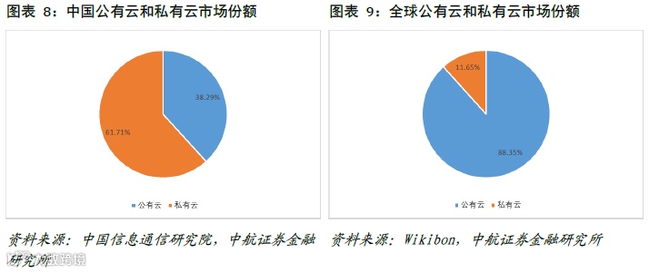 从市场结构来看,我国云计算市场目前以私有云为主,其占比达到61.71%,而在全球云计算市场中,公有云市场份额达到88.35%。国内外云计算市场的结构差异主要来源于,由于对云计算的了解不足、云计算标准缺失、与原信息系统的兼容性问题等因素,目前大中型企业是我国云计算服务的主要用户,而出于对安全性和可控性的追求,该部分客户通常选择私有云作为其IT部署架构,造成了我国云计算市场中公有云的市场份额较少。