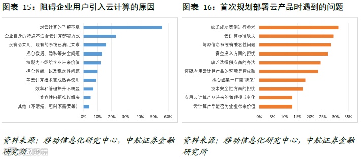 根据移动信息化研究中心发布研究显示,阻碍企业用户引入云计算的原因主要是其对云计算的了解不足,暂时无法做出相应规划,而企业用户在首次规划部署云产品时则面临缺乏成功案例进行参考以及云计算的标准缺失等问题。对此,《云计算发展三年行动计划》表示,将大力发展面向云计算的信息系统规划咨询、方案设计、系统集成和测试评估等服务,并指导标准化机构加快制定云计算资源监控、服务计量计费、应用和数据迁移、工业云服务能力总体要求、云计算服务器技术要求等关键急需技术、服务和应用标准。