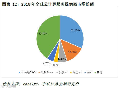 总的来说,我国云计算市场规模增长迅速,但是其体量仍与我国的经济总量并不相称:2017年,我国云计算市场的全球份额占比仅为约9%,而美国云计算四巨头亚马逊、微软、谷歌以及IBM的云计算营收达到全球市场份额的约40%,其中,仅亚马逊一家就占据全球云计算市场份额的31.50%。
