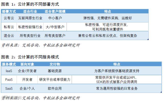 云计算根据部署方式的不同可以分为私有云、公有云和混合云:其中,私有云是被某一单一组织拥有或租用,可以坐落在本地或异地的云基础设施;公有云是被一个提供云计算服务的运营组织所拥有的云基础设施,该组织将云计算服务销售给一般大众或广大的中小企业群体;混合云则由私有云及公有云组成,每种云仍然保持独立实体,但用标准的或专有的技术将它们组合起来,从而具有数据和应用程序的可移植性。根据服务模式的不同,云计算又可以分为IaaS(基础设施即服务)、PaaS(平台即服务)与SaaS(软件即服务):其中,IaaS是以虚拟化、自动化和服务化为特征的云平台,通过Internet为用户提供基础资源服务和业务快速部署能力;PaaS是构建在基础设施之上的软件研发的平台,以SaaS的模式将软件研发平台作为一种服务提交给用户;SaaS是一种通过 Internet 提供软件的模式:用户无需购买软件,而是向提供商租用基于Web的软件。