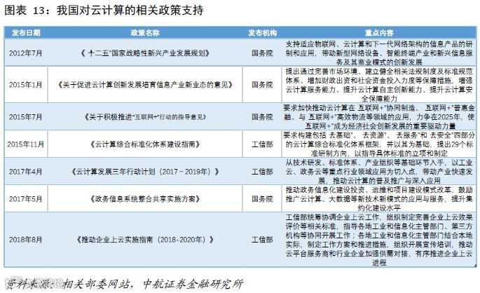与传统IT部署结构相比,云计算实现了资源的按需供给以及数据的充分利用,为物联网、大数据等新兴领域的发展提供了基础支撑,未来将成为我国信息化建设主要形态和建设网络强国、制造强国的重要支撑,推动经济社会各领域信息化水平大幅提高。近年来,政府出台了一系列政策以促进云计算产业的发展。