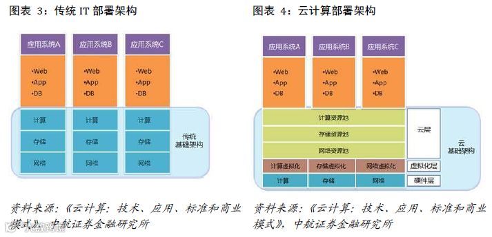 如果说以往的IT建设是“烟囱式”的建设,云计算则打破了烟囱,将全部IT资源变成了一个个池子。在传统IT“烟囱”模式部署架构中,新的应用系统上线时,由于新、旧应用系统所需的运行环境的差异性以及对可靠性、稳定性、运维管理问题的考量,用户往往选择新增与应用系统配套的计算、存储和网络等硬件设备。同时,考虑到未来3到5年的业务发展以及突发需求,为满足应用系统的性能、容量承载需求,用户往往会使用超过当前实际规格和数量需求的硬件设备,造成了硬件设备利用率的低下。此外,随着应用系统的增多,IT资源的效率、拓展性、可管理性都面临很大的挑战。